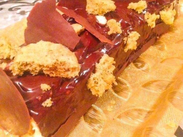 Pour la réalisation de cette bûche spéciale hannukkah il y a le biscuit, un praliné maison, une crème diplomate praliné, le glaçager miroir chocolat, un sponge cake et quelle que tuile de chocolat.